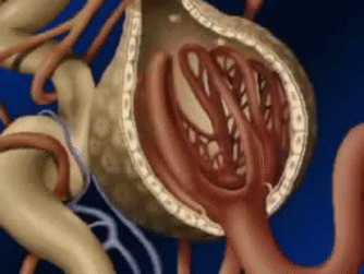 La formación de orina comienza cuando una gran cantidad de líquido que casi no dispone de proteínas se filtra desde los capilares glomerulares a la cápsula de Bowman.